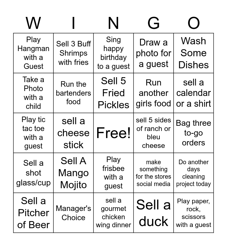 This bingo card has a free space and 24 words: Sell A Mango Mojito, Manager's Choice, Sell 5 Fried Pickles, Sell a Pitcher of Beer, Wash Some Dishes, Play Hangman with a Guest, Take a Photo with a child, Sell 3 Buff Shrimps with fries, sell 5 sides of ranch or bleu cheese, Play frisbee with a guest, Run another girls food, Play tic tac toe with a guest, make something for the stores social media, Do another days cleaning project today, Run the bartenders food, Sell a duck, Bag three to-go orders, Sing happy birthday to a guest, sell a calendar or a shirt, sell a cheese stick, Play paper, rock, scissors with a guest, Sell a shot glass/cup, Draw a photo for a guest and sell a gourmet chicken wing dinner.