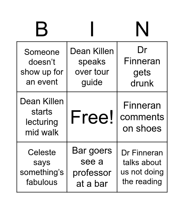 This bingo card has a free space and 8 words: Finneran comments on shoes, Dr Finneran gets drunk, Dean Killen speaks over tour guide, Celeste says something’s fabulous, Someone doesn’t show up for an event, Dr Finneran talks about us not doing the reading, Dean Killen starts lecturing mid walk and Bar goers see a professor at a bar.