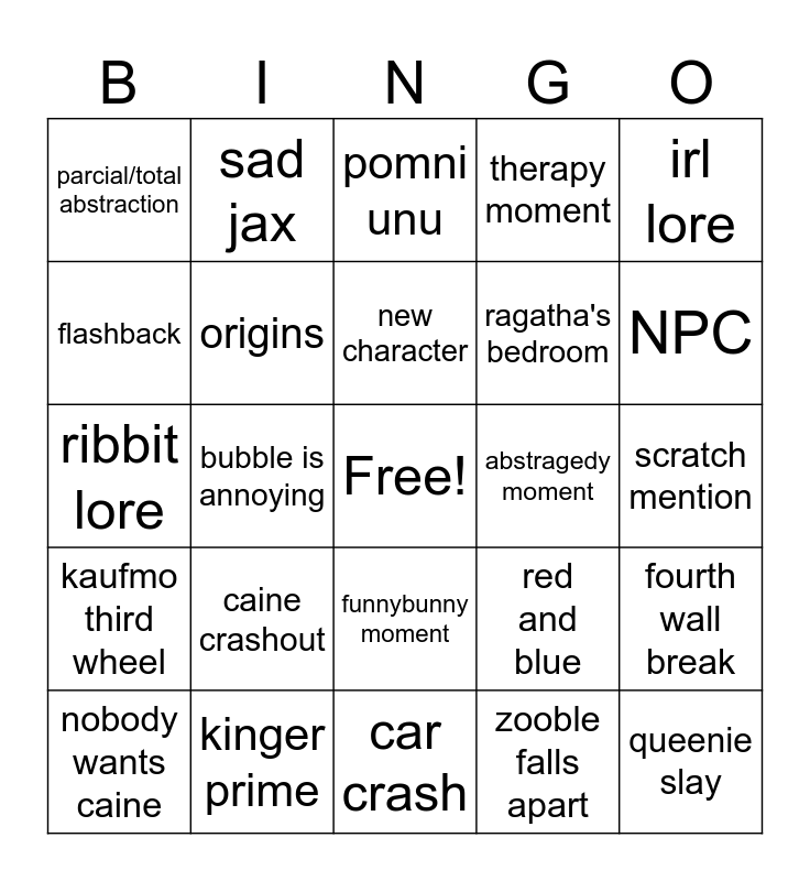 This bingo card has a free space and 24 words: caine crashout, kinger prime, new character, nobody wants caine, irl lore, parcial/total abstraction, flashback, sad jax, abstragedy moment, funnybunny moment, ragatha's bedroom, ribbit lore, red and blue, fourth wall break, origins, zooble falls apart, scratch mention, pomni unu, NPC, bubble is annoying, queenie slay, kaufmo third wheel, therapy moment and car crash.