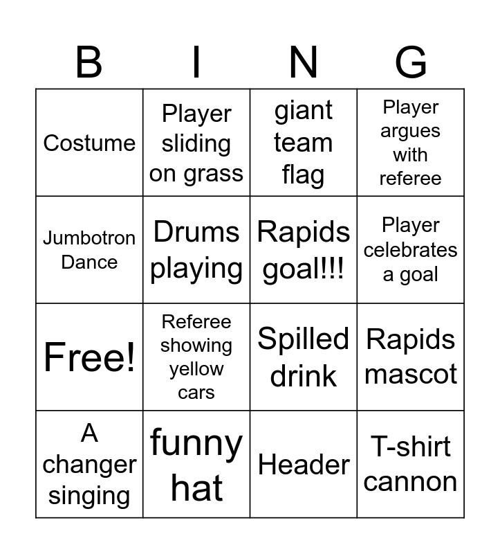 This bingo card has 20 words: Rapids mascot, Someone with face paint, giant team flag, diving goalie, A changer singing, Jumbotron Dance, funny hat, Costume, Free!, Player sliding on grass, Referee showing yellow cars, Spilled drink, Drums playing, T-shirt cannon, Rapids goal!!!, Corner kick, Player celebrates a goal, Player argues with referee, Header and Goalie punt.