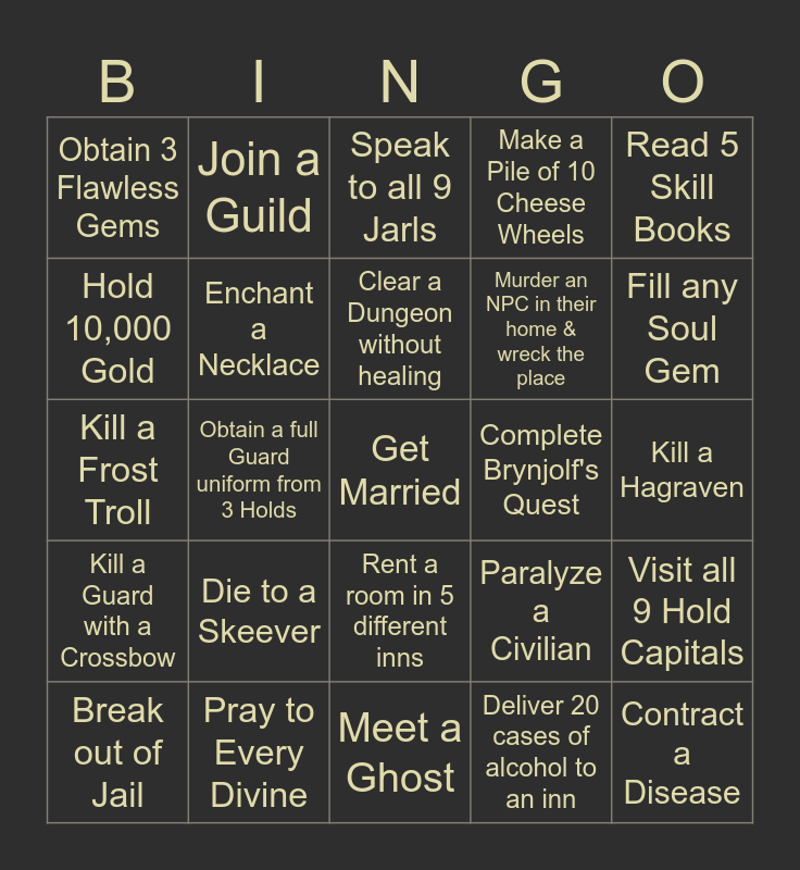 This bingo card has 67 words: Obtain a Dragon Claw, Obtain 5 Words of Power, Sell Skooma, Visit all 9 Hold Capitals, Complete a Quest, Meet both General Tullius & Ulfric Stormcloak, Join a Guild, Clear a Dungeon with no Weapons or Magic, Clear a Dungeon without healing, Win a Brawl, Rent a room in 5 different inns, Kill Grelod the Kind, Kill a Hagraven, Read 5 Skill Books, Learn 5 new Spells, Hold 10,000 Gold, Obtain a full Guard uniform from 3 Holds, Obtain 3 Flawless Gems, Bankrupt a Merchant, Murder an NPC in their home & wreck the place, Die to a Skeever, Kill a Guard with a Crossbow, Make a Pile of 10 Cheese Wheels, Deliver 20 cases of alcohol to an inn, 10,000 Total Bounty, Obtain a Follower, Punch a Jarl, Reach Level 10, Fill any Soul Gem, Interrupt Rogvir's Execution & Escape, Get Married, Steal A Dibella Statue, Bleak Falls Barrow, Feed as a Vampire, Shield Bash an NPC from max HP to 0 HP, Break out of Jail, Pickpocket an Enchanted Ring, Paralyze a Civilian, Kill a Frost Troll, Contract a Disease, Spend EXACTLY 1000 gold in one shopping trip, Enchant a Necklace, Complete Brynjolf's Quest, Enter a Player Home, Kill a Daedra, Kill an enemy using a trap, Loot a Unique Item, Pray to Every Divine, Shoplift 200 gold value from 5 Separate Shops and get away with it, Kill one NPC from all playable races, Speak to all 9 Jarls, Donate to 5 Beggars, Free a Prisoner from Capture, Die to mudcrab, Sell a farmer all their own crops, Meet a Ghost, Kill a Giant and take it's toe, Perform a kill with 5 different weapon types, Craft a backpack, Learn one min. Apprentice Lvl Spell from all 5 schools, Craft a full set of armor, Have a summon/zombie kill another enemy, Buy a house, Become a thane of two holds, Ride a horse off the mountain at greybeards', Speak to 3 Daedric Princes and level a skill to 100.