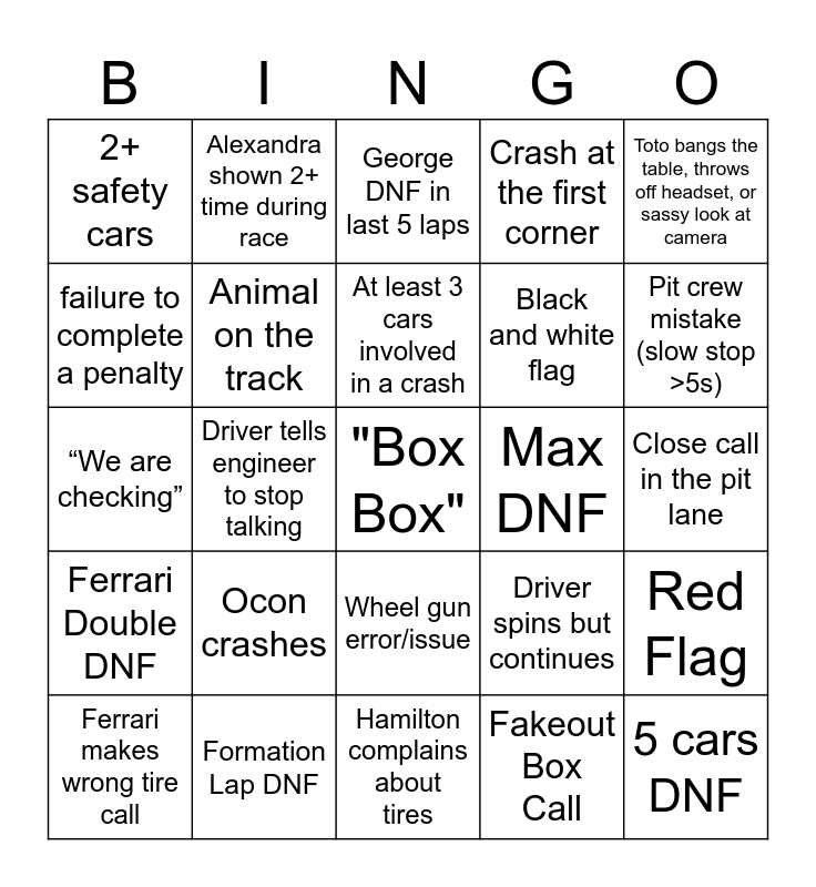 This bingo card has a free space and 62 words: Max complains, Formation Lap DNF, Williams top 10, Ferrari Double DNF, Stroll DNF, All cars finish the race, Animal on the track, Teammates Collide, Black and white flag, P1 gets overtaken on the first lap, Crash at the first corner, speeding in the pit lane penalty, failure to complete a penalty, At least 4 cars involved in a crash, all British podium, 2+ safety cars, 5 cars DNF, Toto bangs the table, throws off headset, or sassy look at camera, Hadjar outscores Max, At least 3 cars involved in a crash, Max DNF, George DNF in last 5 laps, Ferrari makes wrong tire call, Fakeout Box Call, Someone swears on the radio and apologizes for it, Stroll takes someone else out, First time race winner, 2 Red flags in a race, Red Flag, Yellow Flag, Black and Orange Flag, Safety Car, Virtual Safety Car, Unsafe Release Penalty, Close call in the pit lane, Alexandra shown 2+ time during race, Rebecca shown 2+ times during race, Ferrari goes past Plan C, Driver tells engineer to stop talking, Driver starts race from pit lane, “We are checking”, Alonso finishes a race, Ocon crashes, Perez crashes, Pit crew mistake (slow stop >5s), Driver spins but continues, Track limits penalty, Driver ignores team instruction, Camera shows random celebrity during race, Driver argues about tire choice, Wheel gun error/issue, Hamilton complains about tires, Double-stack pit stop, Fire extinguisher used on car, one car DNS, Engine failure, pit stop 2 seconds or less, driver cuts a chicane, Track limits warning announced, Driver asks to swap positions, Stewards note an incident and "the tires are gone".