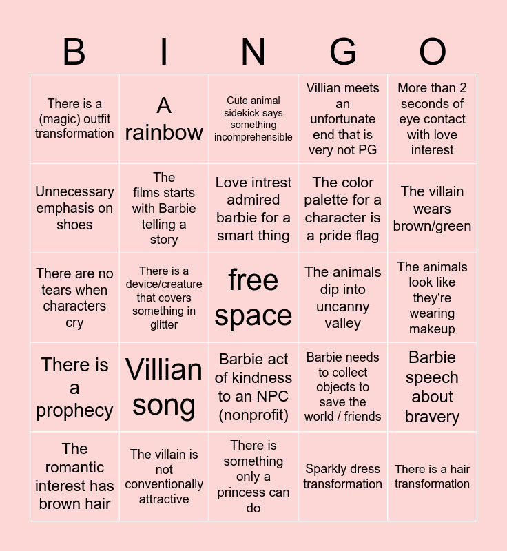 This bingo card has a free space and 29 words: The romantic interest has brown hair, The revival has dark hair, There is a device/creature that covers something in glitter, *Giggles in barbie*, There is a (magic) outfit transformation, Cute animal sidekick says something incomprehensible, The films starts with Barbie telling a story, Villian song, The animals dip into uncanny valley, The villain is not conventionally attractive, The animals look like they're wearing makeup, There is a hair transformation, There is something only a princess can do, Sparkly dress transformation, The villain wears brown/green, Barbie's counterpart is in blue, Barbie act of kindness to an NPC (nonprofit), There is a prophecy, More than 2 seconds of eye contact with love interest, There are no tears when characters cry, Barbie needs to collect objects to save the world / friends, The villain's henchmen are not conventionally attractive, The color palette for a character is a pride flag, Unnecessary emphasis on shoes, Villian meets an unfortunate end that is very not PG, A rainbow, Barbie speech about bravery, Love intrest admired barbie for a smart thing and Magical jewerly is important to move.