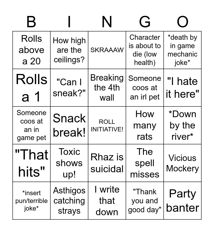 This bingo card has a free space and 24 words: Toxic shows up!, Asthigos catching strays, Breaking the 4th wall, *insert pun/terrible joke*, *death by in game mechanic joke*, Rolls above a 20, Rolls a 1, How high are the ceilings?, How many rats, Rhaz is suicidal, Someone coos at an irl pet, Someone coos at an in game pet, The spell misses, Vicious Mockery, "Can I sneak?", "Thank you and good day", *Down by the river*, SKRAAAW, "I hate it here", Snack break!, Party banter, "That hits", Character is about to die (low health) and I write that down.