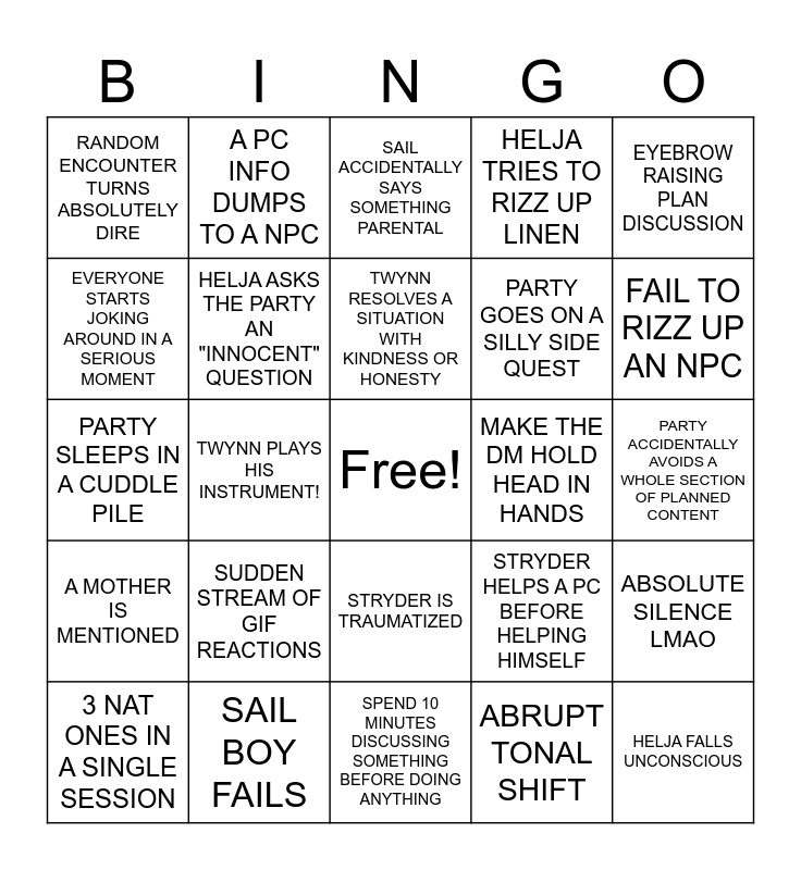 This bingo card has a free space and 24 words: SUDDEN STREAM OF GIF REACTIONS, SAIL BOY FAILS, TWYNN RESOLVES A SITUATION WITH KINDNESS OR HONESTY, 3 NAT ONES IN A SINGLE SESSION, EYEBROW RAISING PLAN DISCUSSION, RANDOM ENCOUNTER TURNS ABSOLUTELY DIRE, EVERYONE STARTS JOKING AROUND IN A SERIOUS MOMENT, A PC INFO DUMPS TO A NPC, MAKE THE DM HOLD HEAD IN HANDS, STRYDER IS TRAUMATIZED, PARTY GOES ON A SILLY SIDE QUEST, PARTY SLEEPS IN A CUDDLE PILE, STRYDER HELPS A PC BEFORE HELPING HIMSELF, ABSOLUTE SILENCE LMAO, HELJA ASKS THE PARTY AN "INNOCENT" QUESTION, ABRUPT TONAL SHIFT, PARTY ACCIDENTALLY AVOIDS A WHOLE SECTION OF PLANNED CONTENT, SAIL ACCIDENTALLY SAYS SOMETHING PARENTAL, FAIL TO RIZZ UP AN NPC, TWYNN PLAYS HIS INSTRUMENT!, HELJA FALLS UNCONSCIOUS, A MOTHER IS MENTIONED, HELJA TRIES TO RIZZ UP LINEN and SPEND 10 MINUTES DISCUSSING SOMETHING BEFORE DOING ANYTHING.