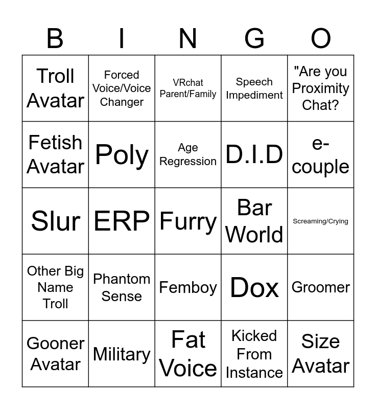 This bingo card has a free space and 24 words: Phantom Sense, Military, Age Regression, Gooner Avatar, "Are you Proximity Chat?, Troll Avatar, Fetish Avatar, Forced Voice/Voice Changer, Bar World, Femboy, D.I.D, Slur, Dox, Groomer, Poly, Kicked From Instance, Screaming/Crying, VRchat Parent/Family, e-couple, ERP, Size Avatar, Other Big Name Troll, Speech Impediment and Fat Voice.
