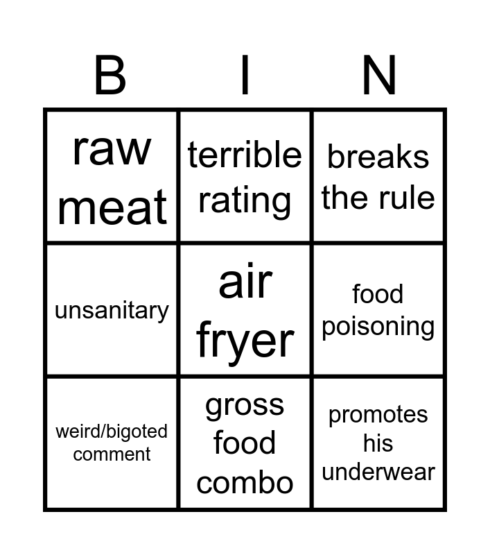 This bingo card has a free space and 8 words: food poisoning, breaks the rule, terrible rating, weird/bigoted comment, raw meat, promotes his underwear, unsanitary and gross food combo.