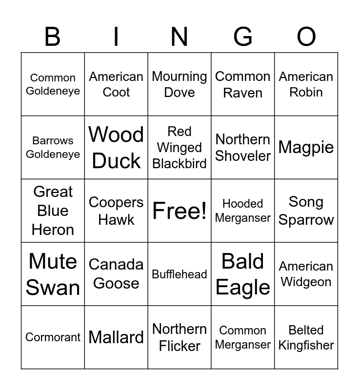 This bingo card has a free space and 24 words: Canada Goose, Mallard, Red Winged Blackbird, Cormorant, American Robin, Common Goldeneye, Barrows Goldeneye, American Coot, Hooded Merganser, Bufflehead, Northern Shoveler, Great Blue Heron, Bald Eagle, American Widgeon, Wood Duck, Common Merganser, Song Sparrow, Mourning Dove, Magpie, Coopers Hawk, Belted Kingfisher, Mute Swan, Common Raven and Northern Flicker.