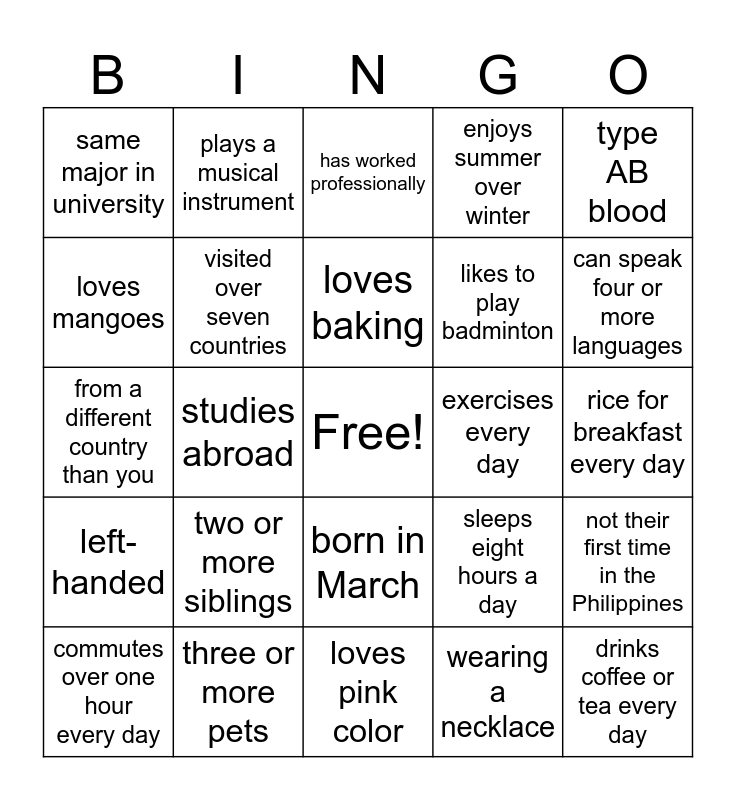 This bingo card has a free space and 24 words: two or more siblings, three or more pets, loves baking, commutes over one hour every day, type AB blood, same major in university, loves mangoes, plays a musical instrument, exercises every day, born in March, likes to play badminton, from a different country than you, sleeps eight hours a day, not their first time in the Philippines, visited over seven countries, wearing a necklace, rice for breakfast every day, has worked professionally, can speak four or more languages, studies abroad, drinks coffee or tea every day, left-handed, enjoys summer over winter and loves pink color.