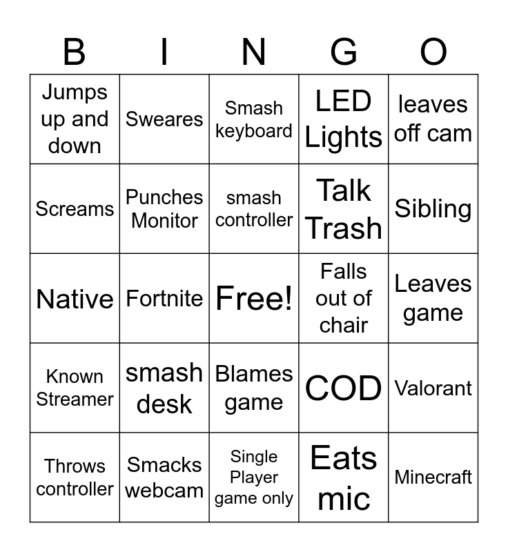 This bingo card has a free space and 24 words: smash desk, Smacks webcam, smash controller, Throws controller, leaves off cam, Jumps up and down, Screams, Sweares, Falls out of chair, Blames game, Talk Trash, Native, COD, Valorant, Punches Monitor, Eats mic, Leaves game, Smash keyboard, Sibling, Fortnite, Minecraft, Known Streamer, LED Lights and Single Player game only.
