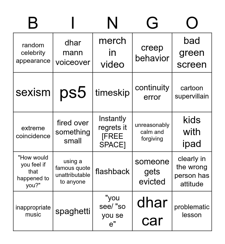 This bingo card has a free space and 31 words: "you see/ "so you see", child with unrealistic emotional maturity, fired over something small, what happens in the dark always comes to light, random celebrity appearance, merch in video, ps5, someone gets evicted, unreasonably calm and forgiving, dhar car, kids with ipad, problematic lesson, Random expensive brand mentioned, dhar mann studios office in the video, cartoon supervillain, parking lot confrontation, clearly in the wrong person has attitude, using a famous quote unattributable to anyone, "How would you feel if that happened to you?", flashback, bad green screen, bad props, inappropriate music, dhar mann voiceover, continuity error, sexism, creep behavior, extreme coincidence, spaghetti, timeskip and dhar mann mention.