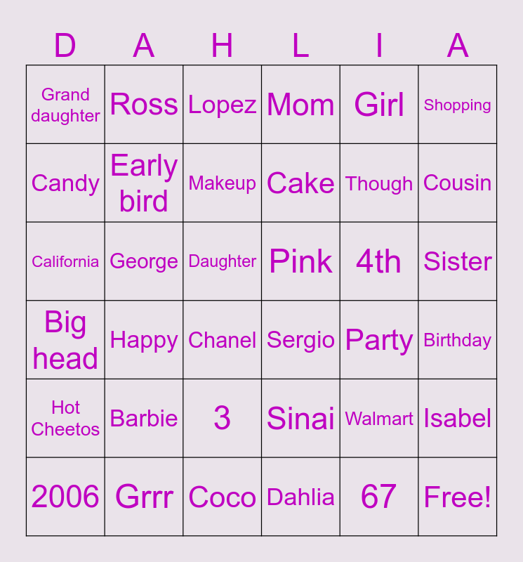 This bingo card has 42 words: 67, Early bird, 10, 4th, Birthday, Happy, California, Vidal, Lopez, Sister, Daughter, Cake, Cousin, Girl, Grrr, Big head, Isabel, Though, Free!, Ross, Shopping, 3, Hot Cheetos, Grand daughter, Selena, 2006, Makeup, Nails, Barbie, Walmart, March, Pink, Candy, Party, Coco, Chanel, Sergio, George, Sinai, Dahlia, Mom and Dad.