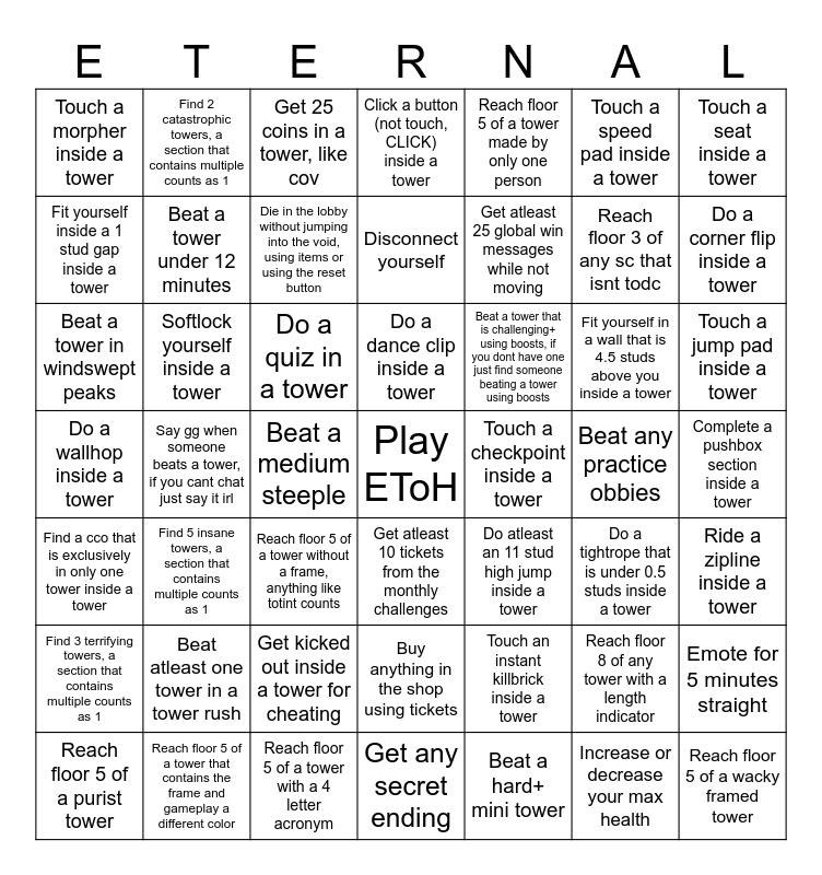 This bingo card has a free space and 48 words: Touch an instant killbrick inside a tower, Reach floor 3 of any sc that isnt todc, Get any secret ending, Say gg when someone beats a tower, if you cant chat just say it irl, Do a quiz in a tower, Complete a pushbox section inside a tower, Find 2 catastrophic towers, a section that contains multiple counts as 1, Reach floor 5 of a tower that contains the frame and gameplay a different color, Touch a speed pad inside a tower, Get atleast 10 tickets from the monthly challenges, Touch a seat inside a tower, Click a button (not touch, CLICK) inside a tower, Fit yourself in a wall that is 4.5 studs above you inside a tower, Beat a tower that is challenging+ using boosts, if you dont have one just find someone beating a tower using boosts, Find 3 terrifying towers, a section that contains multiple counts as 1, Beat any practice obbies, Fit yourself inside a 1 stud gap inside a tower, Do a corner flip inside a tower, Reach floor 8 of any tower with a length indicator, Reach floor 5 of a tower made by only one person, Get atleast 25 global win messages while not moving, Beat a medium steeple, Touch a morpher inside a tower, Beat a tower under 12 minutes, Emote for 5 minutes straight, Die in the lobby without jumping into the void, using items or using the reset button, Touch a jump pad inside a tower, Reach floor 5 of a purist tower, Do a dance clip inside a tower, Softlock yourself inside a tower, Increase or decrease your max health, Touch a checkpoint inside a tower, Ride a zipline inside a tower, Beat atleast one tower in a tower rush, Do a wallhop inside a tower, Do atleast an 11 stud high jump inside a tower, Do a tightrope that is under 0.5 studs inside a tower, Beat a tower in windswept peaks, Reach floor 5 of a tower without a frame, anything like totint counts, Get kicked out inside a tower for cheating, Find a cco that is exclusively in only one tower inside a tower, Reach floor 5 of a wacky framed tower, Get 25 coins in a tower, like cov, Reach floor 5 of a tower with a 4 letter acronym, Disconnect yourself, Buy anything in the shop using tickets, Find 5 insane towers, a section that contains multiple counts as 1 and Beat a hard+ mini tower.