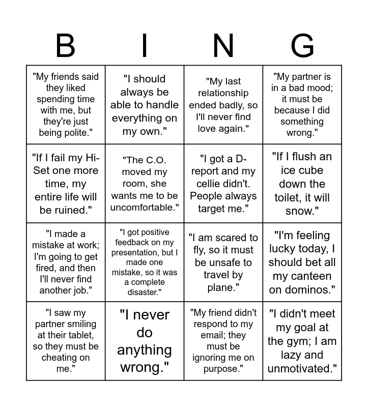 This bingo card has 18 words: "I got positive feedback on my presentation, but I made one mistake, so it was a complete disaster.", "I didn't meet my goal at the gym; I am lazy and unmotivated.", "My last relationship ended badly, so I'll never find love again.", "My friends said they liked spending time with me, but they're just being polite.", "I am scared to fly, so it must be unsafe to travel by plane.", "My partner is in a bad mood; it must be because I did something wrong.", "I saw my partner smiling at their tablet, so they must be cheating on me.", "I should always be able to handle everything on my own.", "If I flush an ice cube down the toilet, it will snow.", "I made a mistake at work; I'm going to get fired, and then I'll never find another job.", "My friend didn't respond to my email; they must be ignoring me on purpose.", "If I fail my Hi-Set one more time, my entire life will be ruined.", "I'm feeling lucky today, I should bet all my canteen on dominos.", "The C.O. moved my room, she wants me to be uncomfortable.", "I got a D-report and my cellie didn't. People always target me.", "People should always treat me fairly.", "I never do anything wrong." and "She didn't say hi back. She probably hates me.".