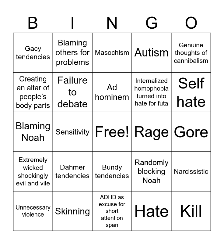 This bingo card has a free space and 24 words: Dahmer tendencies, Skinning, Ad hominem, Unnecessary violence, Genuine thoughts of cannibalism, Gacy tendencies, Creating an altar of people’s body parts, Blaming others for problems, Rage, Bundy tendencies, Internalized homophobia turned into hate for futa, Blaming Noah, Randomly blocking Noah, Narcissistic, Failure to debate, Hate, Gore, Masochism, Self hate, Sensitivity, Kill, Extremely wicked shockingly evil and vile, Autism and ADHD as excuse for short attention span.