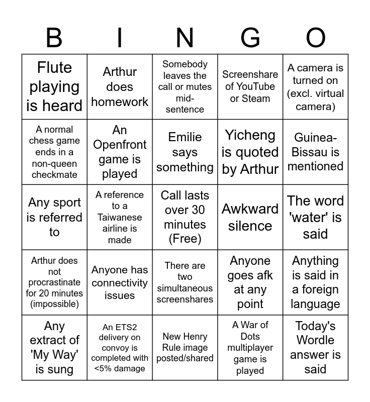 This bingo card has a free space and 24 words: Anyone has connectivity issues, An ETS2 delivery on convoy is completed with <5% damage, Emilie says something, Any extract of 'My Way' is sung, A camera is turned on (excl. virtual camera), Flute playing is heard, A normal chess game ends in a non-queen checkmate, Arthur does homework, Awkward silence, There are two simultaneous screenshares, Yicheng is quoted by Arthur, Any sport is referred to, Anyone goes afk at any point, Anything is said in a foreign language, An Openfront game is played, A War of Dots multiplayer game is played, The word 'water' is said, Somebody leaves the call or mutes mid-sentence, Guinea-Bissau is mentioned, A reference to a Taiwanese airline is made, Today's Wordle answer is said, Arthur does not procrastinate for 20 minutes (impossible), Screenshare of YouTube or Steam and New Henry Rule image posted/shared.