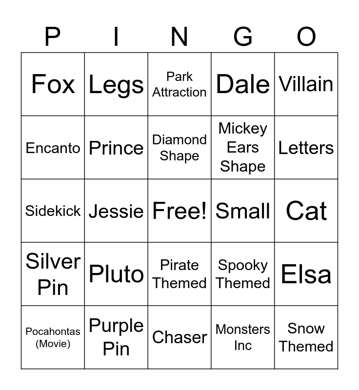 This bingo card has a free space and 24 words: Pluto, Purple Pin, Diamond Shape, Pocahontas (Movie), Villain, Fox, Encanto, Legs, Small, Pirate Themed, Mickey Ears Shape, Sidekick, Spooky Themed, Elsa, Prince, Monsters Inc, Cat, Park Attraction, Letters, Jessie, Snow Themed, Silver Pin, Dale and Chaser.