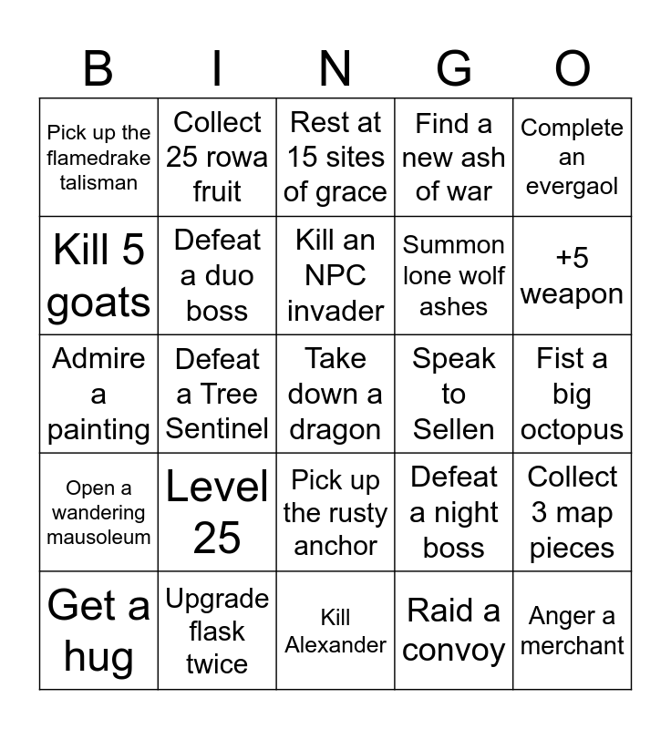 This bingo card has a free space and 24 words: Level 25, Upgrade flask twice, Kill an NPC invader, Get a hug, Complete an evergaol, Pick up the flamedrake talisman, Kill 5 goats, Collect 25 rowa fruit, Speak to Sellen, Pick up the rusty anchor, Summon lone wolf ashes, Admire a painting, Defeat a night boss, Collect 3 map pieces, Defeat a duo boss, Raid a convoy, Fist a big octopus, Rest at 15 sites of grace, +5 weapon, Defeat a Tree Sentinel, Anger a merchant, Open a wandering mausoleum, Find a new ash of war and Kill Alexander.