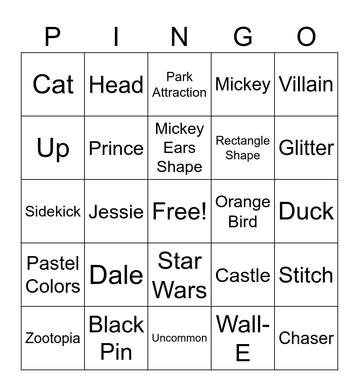 This bingo card has a free space and 24 words: Dale, Black Pin, Mickey Ears Shape, Zootopia, Villain, Cat, Up, Head, Orange Bird, Star Wars, Rectangle Shape, Sidekick, Castle, Stitch, Prince, Wall-E, Duck, Park Attraction, Glitter, Jessie, Chaser, Pastel Colors, Mickey and Uncommon.