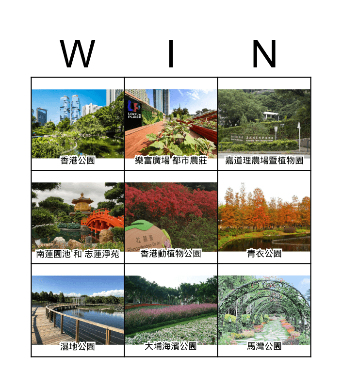 This bingo card has 9 images and 9 words: 濕地公園, 嘉道理農場暨植物園, 樂富廣場 都市農莊, 南蓮園池 和 志蓮淨苑, 香港公園, 青衣公園, 香港動植物公園, 馬灣公園 and 大埔海濱公園.