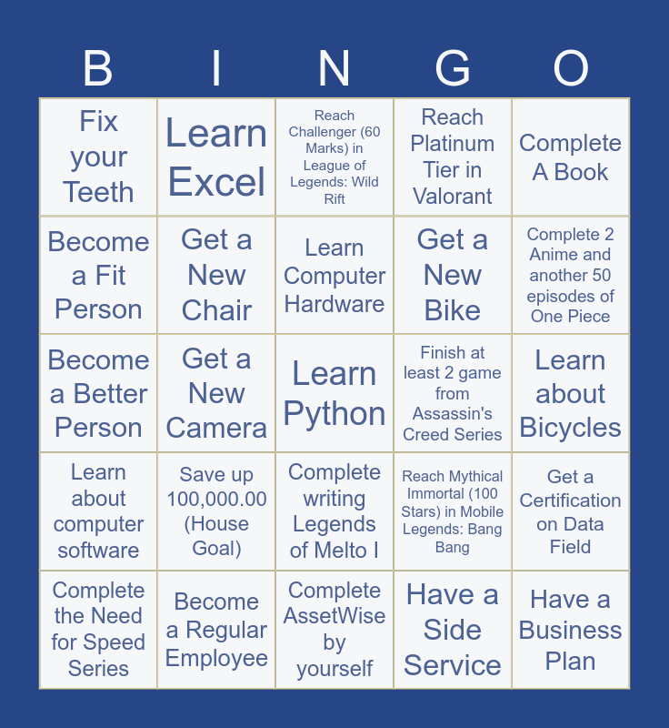 This bingo card has a free space and 24 words: Save up 100,000.00 (House Goal), Become a Regular Employee, Learn Computer Hardware, Complete the Need for Speed Series, Complete A Book, Fix your Teeth, Become a Fit Person, Learn Excel, Finish at least 2 game from Assassin's Creed Series, Complete writing Legends of Melto I, Get a New Bike, Become a Better Person, Reach Mythical Immortal (100 Stars) in Mobile Legends: Bang Bang, Get a Certification on Data Field, Get a New Chair, Have a Side Service, Learn about Bicycles, Reach Challenger (60 Marks) in League of Legends: Wild Rift, Complete 2 Anime and another 50 episodes of One Piece, Get a New Camera, Have a Business Plan, Learn about computer software, Reach Platinum Tier in Valorant and Complete AssetWise by yourself.