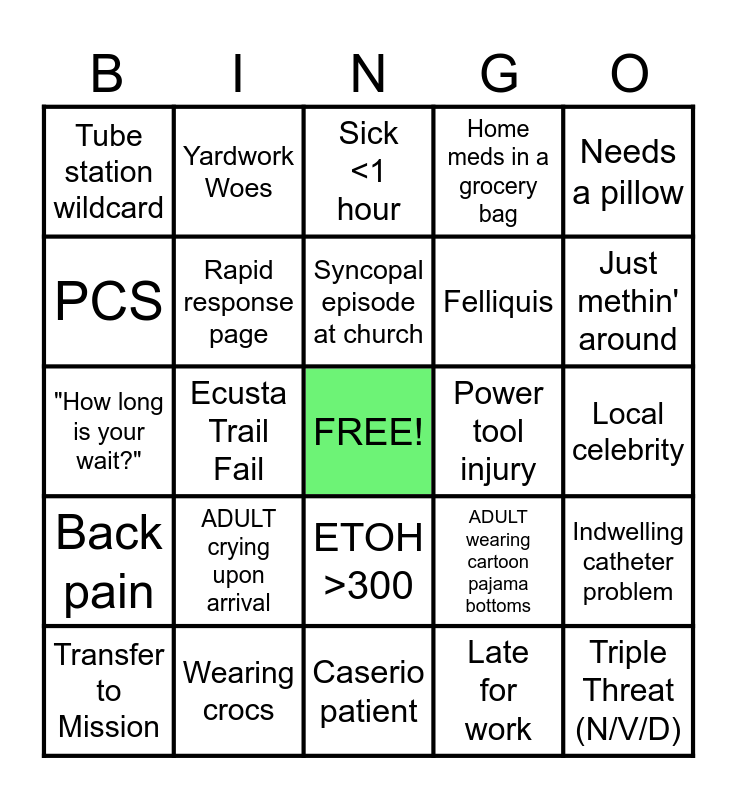 This bingo card has a free space and 24 words: ADULT crying upon arrival, Wearing crocs, Syncopal episode at church, Transfer to Mission, Needs a pillow, Tube station wildcard, PCS, Yardwork Woes, Power tool injury, ETOH >300, Felliquis, "How long is your wait?", ADULT wearing cartoon pajama bottoms, Indwelling catheter problem, Rapid response page, Late for work, Local celebrity, Sick <1 hour, Just methin' around, Ecusta Trail Fail, Triple Threat (N/V/D), Back pain, Home meds in a grocery bag and Caserio patient.