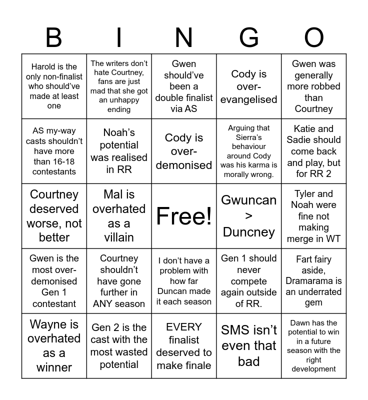This bingo card has a free space and 24 words: Courtney shouldn’t have gone further in ANY season, Gen 2 is the cast with the most wasted potential, Cody is over-demonised, Wayne is overhated as a winner, Gwen was generally more robbed than Courtney, Harold is the only non-finalist who should’ve made at least one, AS my-way casts shouldn’t have more than 16-18 contestants, The writers don’t hate Courtney, fans are just mad that she got an unhappy ending, Gwuncan > Duncney, I don’t have a problem with how far Duncan made it each season, Arguing that Sierra’s behaviour around Cody was his karma is morally wrong., Courtney deserved worse, not better, Gen 1 should never compete again outside of RR., Fart fairy aside, Dramarama is an underrated gem, Noah’s potential was realised in RR, SMS isn’t even that bad, Tyler and Noah were fine not making merge in WT, Gwen should’ve been a double finalist via AS, Katie and Sadie should come back and play, but for RR 2, Mal is overhated as a villain, Dawn has the potential to win in a future season with the right development, Gwen is the most over-demonised Gen 1 contestant, Cody is over-evangelised and EVERY finalist deserved to make finale.