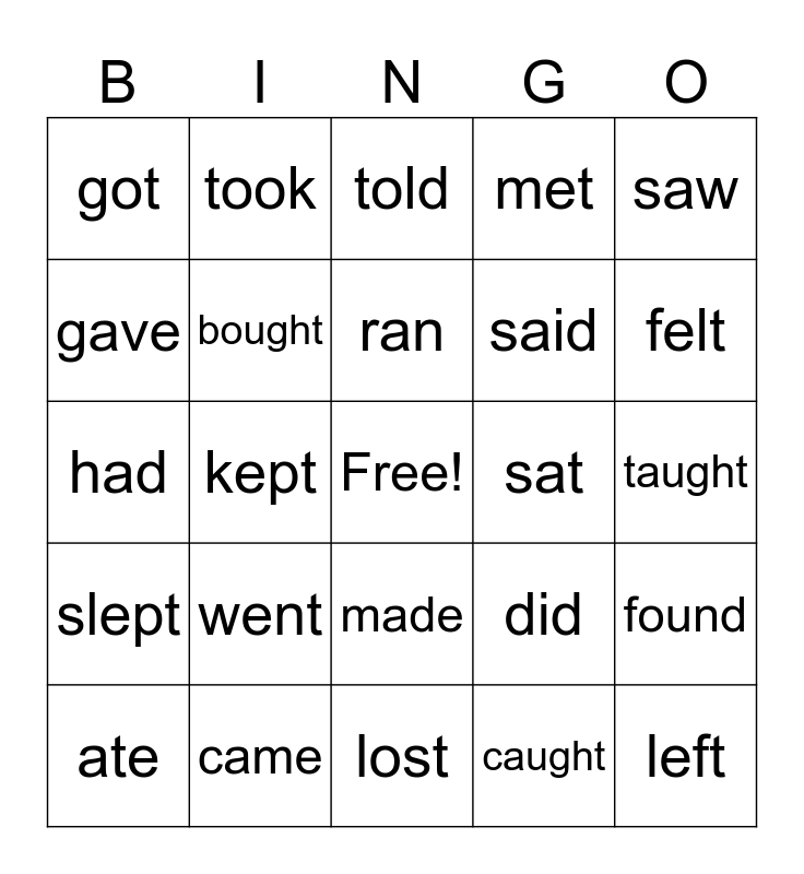 This bingo card has a free space and 24 words: went, came, ran, ate, saw, got, gave, took, sat, made, said, had, did, found, bought, caught, taught, told, felt, kept, left, slept, met and lost.