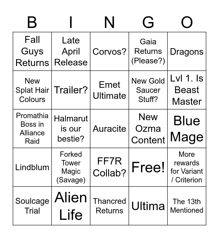 This bingo card has 25 words: Forked Tower Magic (Savage), Thancred Returns, Emet Ultimate, Soulcage Trial, Dragons, Fall Guys Returns, New Splat Hair Colours, Late April Release, New Ozma Content, FF7R Collab?, New Gold Saucer Stuff?, Promathia Boss in Alliance Raid, Free!, More rewards for Variant / Criterion, Trailer?, The 13th Mentioned, Blue Mage, Corvos?, Lvl 1. Is Beast Master, Halmarut is our bestie?, Auracite, Alien Life, Lindblum, Gaia Returns (Please?) and Ultima.