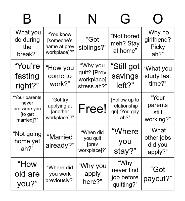 This bingo card has a free space and 24 words: “How old are you?”, “Married already?”, “Why you quit? [Prev workplace] stress ah?”, “Why never find job before quitting?”, “Why no girlfriend? Picky ah?”, “What you do during the break?”, “You know [someone’s name at prev workplace]?”, “Got siblings?”, [Follow up to relationship qn] “You gay ah?”, “Your parents still working?”, “Your parents never pressure you [to get married]?”, “How you come to work?”, “Where you stay?”, “What other jobs did you apply?”, “You’re fasting right?”, “Where did you work previously?”, “Why you apply here?”, “Not bored meh? Stay at home”, “What you study last time?”, “Not going home yet ah?”, “Got try applying at [another workplace]?”, “When did you quit [prev workplace]?”, “Still got savings left?” and “Got paycut?”.