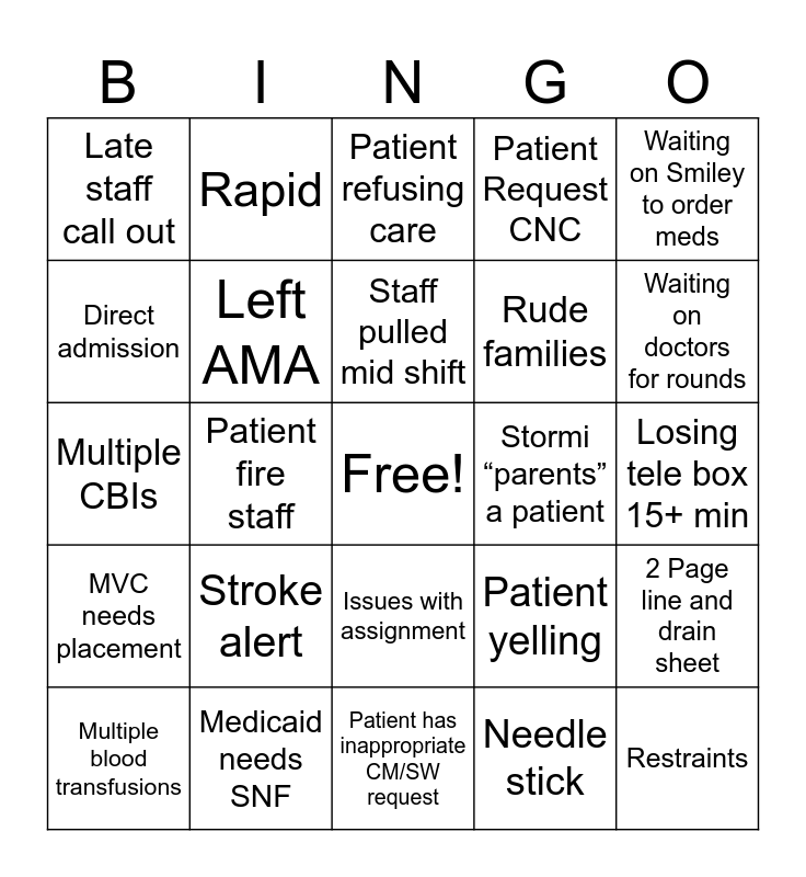 This bingo card has a free space and 77 words: 3 Discharges on one nurse, Racist patient, Patient refusing care, Death, Super Charge, Staff Cry, No Pens, Over 12 DC’s, Patient Urinate on Floor, Code Blue, Understaff on Nurses, Understaff on PCTs, Staff pulled mid shift, Direct admission, Combative patient, Patient fire staff, Code Brown, Restraints, Security event, Waiting on Smiley to order meds, Patient Fall, Multiple CBIs, Left AMA, Rapid, Patient Request CNC, Found drugs, Leaky Ostomy, Works with Kelsey/Lauryn, Emergency transfer, Body fluids touch skin, Back-to-back admissions, Home pharmacy issues, Fire alarm activation, Patient yelling, Waiting on doctors for rounds, Rude families, Nurses floated to another unit, Family press staff assist, Losing tele box 15+ min, Needle stick, Condom cath fails 3x, Patient refuses to leave, DC order in, med red not done, Patients removing their own IV, Connie gets 3 IVs in one shift, Multiple PCAs, Multiple blood transfusions, Late staff call out, NCNS, Family member down, Staff floated to other unit, Issues with assignment, Guardianship patient, Katie misses IV/blood draw, 3 confused patients on a nursing assignment, 5 sugar checks for one nurse, 8 ACHS for techs, NS complaints, O Complaints, Code: False alarm hospital wide, Stroke alert, 2 or more sitters, Stormi/ Arletty late to huddle, Admission at 17:45, Patient throwing stuff, DCL comes to unit; patient not ready, Oncology stealing supplies, Stormi “parents” a patient, Ryan calls a Pow-Wow, EMS late/delayed, Employee health event report, 2 Page line and drain sheet, MVC needs placement, Medicaid needs SNF, Patient requests patient advocate, Patient has inappropriate CM/SW request and Patient transfer to other hospital.