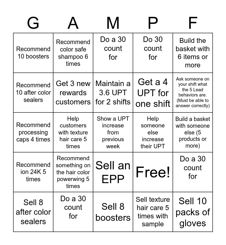 This bingo card has 25 words: Recommend something on the hair color powerwing 5 times, Sell 8 boosters, Maintain a 3.6 UPT for 2 shifts, Sell 8 after color sealers, Build the basket with 6 items or more, Recommend 10 boosters, Recommend 10 after color sealers, Recommend color safe shampoo 6 times, Help someone else increase their UPT, Sell an EPP, Get a 4 UPT for one shift, Recommend processing caps 4 times, Free!, Do a 30 count for, Get 3 new rewards customers, Sell 10 packs of gloves, Build a basket with someone else (5 products or more), Do a 30 count for, Ask someone on your shift what the 5 Lead behaviors are. (Must be able to answer correctly), Help customers with texture hair care 5 times, Show a UPT increase from previous week, Do a 30 count for, Recommend ion 24K 5 times, Do 30 count for and Sell texture hair care 5 times with sample.