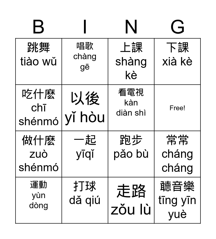 This bingo card has 16 words: 打球 dǎ qiú, 常常 cháng cháng, 上課shàng kè, 跳舞 tiào wǔ, 做什麽 zuò shénmó, 唱歌 chàng gē, 跑步 pǎo bù, 走路zǒu lù, 吃什麽 chī shénmó, 以後 yǐ hòu, 運動 yùn dòng, 下課 xià kè, 一起 yīqǐ, Free!, 看電視 kàn diàn shì and 聼音樂 tīng yīn yuè.