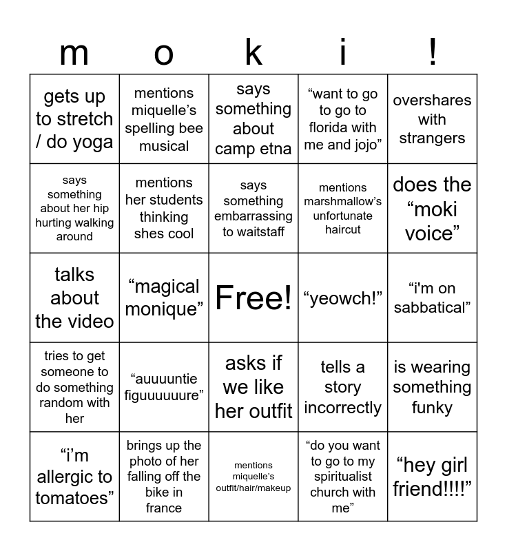 This bingo card has a free space and 24 words: “auuuuntie figuuuuuure”, brings up the photo of her falling off the bike in france, says something embarrassing to waitstaff, “i’m allergic to tomatoes”, overshares with strangers, gets up to stretch / do yoga, says something about her hip hurting walking around, mentions miquelle’s spelling bee musical, “yeowch!”, asks if we like her outfit, mentions marshmallow’s unfortunate haircut, talks about the video, tells a story incorrectly, is wearing something funky, mentions her students thinking shes cool, “do you want to go to my spiritualist church with me”, “i'm on sabbatical”, says something about camp etna, does the “moki voice”, “magical monique”, “hey girl friend!!!!”, tries to get someone to do something random with her, “want to go to go to florida with me and jojo” and mentions miquelle’s outfit/hair/makeup.