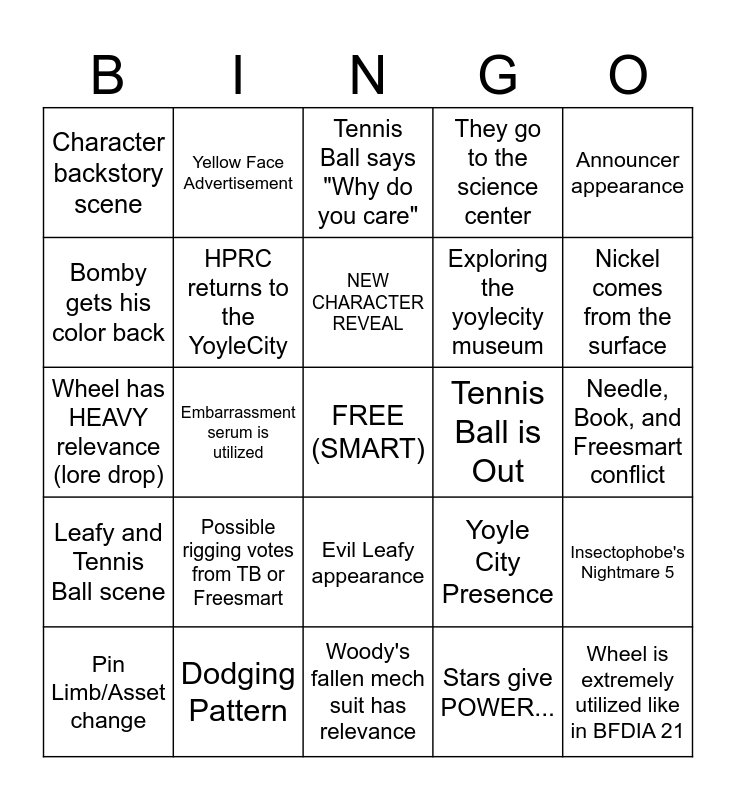 This bingo card has a free space and 24 words: Possible rigging votes from TB or Freesmart, Dodging Pattern, NEW CHARACTER REVEAL, Pin Limb/Asset change, Announcer appearance, Character backstory scene, Bomby gets his color back, Yellow Face Advertisement, Tennis Ball is Out, Evil Leafy appearance, Exploring the yoylecity museum, Wheel has HEAVY relevance (lore drop), Yoyle City Presence, Insectophobe's Nightmare 5, HPRC returns to the YoyleCity, Stars give POWER..., Needle, Book, and Freesmart conflict, Tennis Ball says "Why do you care", Nickel comes from the surface, Embarrassment serum is utilized, Wheel is extremely utilized like in BFDIA 21, Leafy and Tennis Ball scene, They go to the science center and Woody's fallen mech suit has relevance.