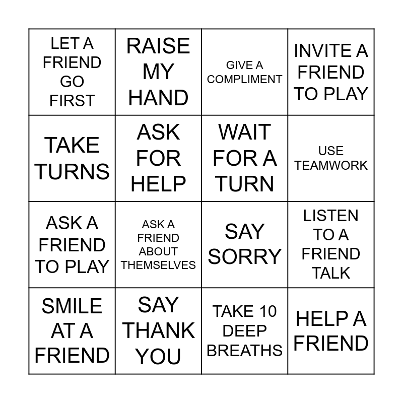 This bingo card has 25 words: Free!, SHARE A TOY, USE TEAMWORK, CHEER FOR A FRIEND, TAKE TURNS, LET A FRIEND GO FIRST, ASK FOR HELP, RAISE MY HAND, SAY THANK YOU, ASK FOR A BREAK, ASK A FRIEND TO PLAY, SAY SORRY, SAY PLEASE, GIVE SOMEONE ELSE A TURN, WAIT FOR A TURN, NO BLURTING, TAKE 10 DEEP BREATHS, GIVE A COMPLIMENT, ASK A FRIEND ABOUT THEMSELVES, LISTEN TO A FRIEND TALK, SMILE AT A FRIEND, CLEAN UP AFTER YOURSELF, HELP A FRIEND, INVITE A FRIEND TO PLAY and LET IT GO.