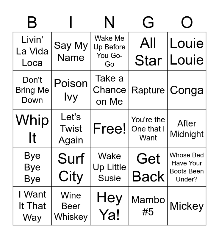 This bingo card has a free space and 43 words: Tossin' and Turnin', Mickey, Wannabe, I Want It That Way, Twist and Shout, Mambo #5, Wake Me Up Before You Go-Go, PYT, Louie Louie, Wine Beer Whiskey, All Star, You're the One that I Want, Wake Up Little Susie, Surf City, Pour Some Sugar On Me, Hey Ya!, You Might Think, Whip It, Don't Stop Believing, Conga, Say My Name, Cotton Eye Joe, Burning Love, Livin' La Vida Loca, Could You Be Loved?, After Midnight, Joy to the World, I Got a Feeling, Get Back, Bye Bye Bye, Pontoon, Whose Bed Have Your Boots Been Under?, Sold, Let's Twist Again, Fun Fun Fun, Down on the Corner, Start Me Up, Take a Chance on Me, Don't Bring Me Down, Rapture, Witch Doctor, Poison Ivy and Baby.