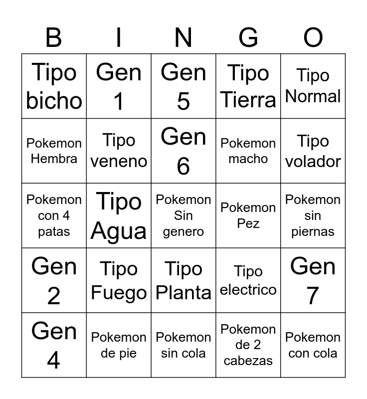 This bingo card has a free space and 24 words: Tipo Fuego, Pokemon de pie, Gen 6, Gen 4, Tipo Normal, Tipo bicho, Pokemon Hembra, Gen 1, Pokemon Pez, Tipo Planta, Pokemon macho, Pokemon con 4 patas, Tipo electrico, Gen 7, Tipo veneno, Pokemon de 2 cabezas, Pokemon sin piernas, Gen 5, Tipo volador, Tipo Agua, Pokemon con cola, Gen 2, Tipo Tierra and Pokemon sin cola.