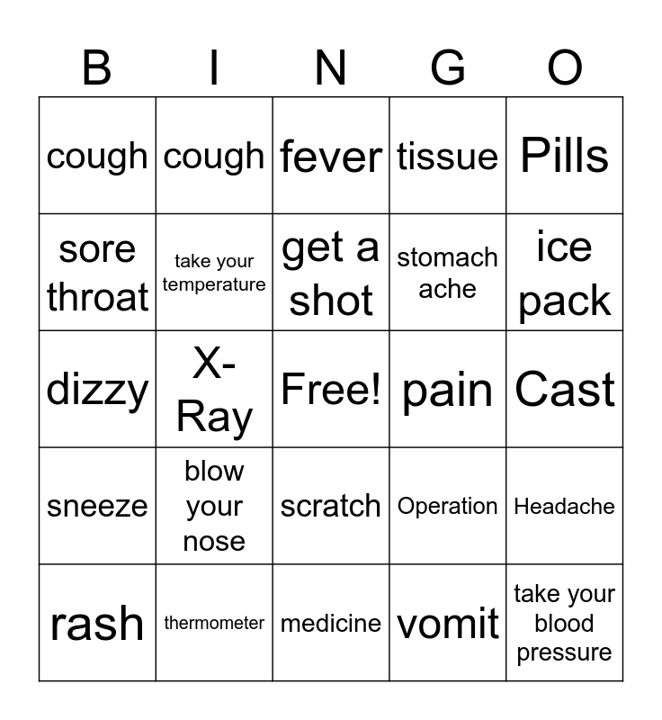 This bingo card has a free space and 28 words: Headache, Stuffy nose, stomach ache, vomit, sore throat, fever, cough, sneeze, pain, rash, dizzy, tissue, thermometer, medicine, ice pack, bandage, blow your nose, take your temperature, get a shot, scratch, cough, sneeze, take your blood pressure, X-Ray, Cast, Operation, Pills and Cream.
