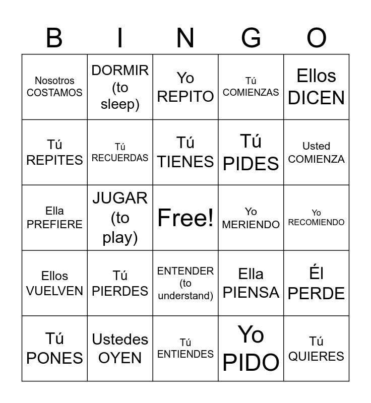 This bingo card has a free space and 184 words: PONER (to put), Yo PONGO, Tú PONES, Ella PONE, Nosotros PONEMOS, Ellos PONEN, VENIR (to come), Yo VENGO, Tú VIENES, Ella VIENE, Nosotros VENEMOS, Ellos VIENEN, TENER (to have), Yo TNEGO, Tú TIENES, Ella TIENE, Nosotros TENEMOS, Ustedes TIENEN, CAER (to fall), Yo CAIGO, Tú CAES, Usted CAE, Nosotras CAEMOS, Ellas CAEN, TRAER (to bring), Yo TRAIGO, Tú TRAES, Ella TRAE, Nosotros TRAEMOS, Ellos TRAEN, HACER (to do/make), Yo HAGO, Tú HACES, Él HACE, Nosotros HACEMOS, Ustedes HACEN, SALIR (to leave/exit), Yo SALGO, SALES, Él SALE, Ellas SALEN, DECIR (to say), Yo DIGO, Él DICE, DECIMOS, Ellos DICEN, OIR (to hear), Yo OIGO, Tú OYES, Él OYE, Ustedes OYEN, PEDIR (to ask), Yo PIDO, Tú PIDES, Nosotros PEDIMOS, Ellas PIDEN, SERVIR (to serve), Tú SIRVES, Él SIRVE, Nosotros SERVIOMS, Ustedes SIRVEN, REPETIR (to repeat), Yo REPITO, Tú REPITES, Ella REPITE, Ellas REPITEN, COMPETIR (to compete), Yo COMPITO, Tú COMPITES, Usted COMPITE, Nosotras COMPETIMOS, Ustedes COMPITEN, DORMIR (to sleep), DUERMO, Tú DUERMES, Él DUERME, DORMIMIOS, Ellos DUERMEN, PODER (can/be able to), Yo PUEDO, Tú PUEDES, Ella PUEDE, PODEMOS, Ustedes PUEDEN, CONTAR (to count), Yo CUENTO, Tú CUENTAS, Usted CONTAMOS, COLGAR (to hang), Yo CUELGO, Tú CUELGAS, Nosotros COLGAMOS, VOLVER (to go back), Yo VUELVO, Tú VUELVES, Él VUELVE, Ellos VUELVEN, MORIR (to die), Yo MUERO, Tú MUERES, Él MUERE, RECORDAR(to remember), Yo RECUERDO, Tú RECUERDAS, Ella RECUERDA, Nosotros RECORDAMOS, Ellas RECUERDAN, COSTAR (to cost), Yo CUESTO, Tú CUESTAS, Ella CUESTA, Nosotros COSTAMOS, Ellos CUESTAN, ALMORZAR (to eat lunch), Yo ALMUERZO, Tú ALMUERZAS, Ella ALMUERZA, Nosotros ALMORZAMOS, Ustedes ALMUERZAN, QUERER (to want), Yo QUIERO, Tú QUIERES, Ella QUIERE, Nosotros QUEREMOS, Ellas QUIEREN, CERRAR (to close), Yo CIERRO, Tú CIERRAS, Él CIERRA, Nosotros CERRAMOS, Ellos CIERRAN, COMENZAR (to start), Yo COMIENZAO, Tú COMIENZAS, Usted COMIENZA, Nosotros COMENZAMOS, Ustedes COMIENZAN, RECOMENDAR (to recommend), Yo RECOMIENDO, Tú RECOMIENDAS, Él RECOMIENDA, Ellos RECOMIENDAN, PENSAR (to think), Yo PIENSO, Tú PIENSAS, Ella PIENSA, Nosotras PENSAMOS, Ustedes PIENSAN, EMPEZAR (to begin), Yo EMPIEZO, Tú EMPIEZAS, Ella EMPIEZA, Nosotras EMPEZAMOS, Ellas EMPIEZAN, ENTENDER (to understand), Yo ENTIENDO, Tú ENTIENDES, Usted ENTIENDE, Nosotros ENTENDEMOS, Ellos ENTIENDEN, MERENDAR (to snack), Yo MERIENDO, Tú MERIENDAS, Usted MERIENDA, Nosotros MERENDAMOS, Ustedes MERIENDAN, PERDER (to lose), Yo PIERDO, Tú PIERDES, Él PERDE, Nosotros PERDEMOS, Ellas PIERDEN, PREFERIR (to prefer), Yo PREFIERO, TúPREFIERES, Ella PREFIERE, Nosotros PREFERIMOS, Ellos PREFIEREN, JUGAR (to play), Yo JUEGO, Tú JUEGAS, Él JUEGA, Nosotros JUGAMOS and Ellas JUEGAN.