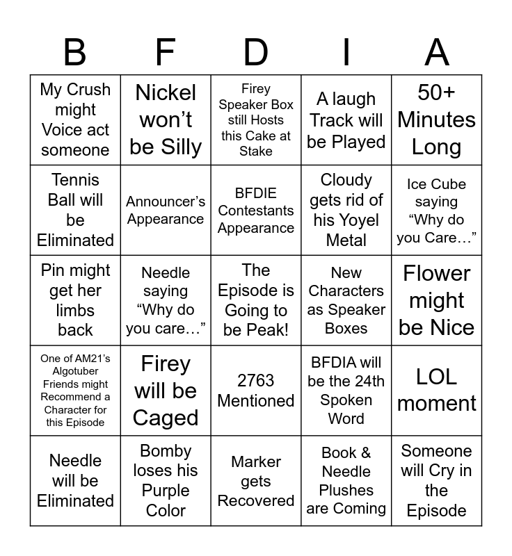 This bingo card has a free space and 24 words: Firey will be Caged, Bomby loses his Purple Color, BFDIE Contestants Appearance, Needle will be Eliminated, 50+ Minutes Long, My Crush might Voice act someone, Tennis Ball will be Eliminated, Nickel won’t be Silly, New Characters as Speaker Boxes, 2763 Mentioned, Cloudy gets rid of his Yoyel Metal, Pin might get her limbs back, BFDIA will be the 24th Spoken Word, LOL moment, Announcer’s Appearance, Book & Needle Plushes are Coming, Flower might be Nice, Firey Speaker Box still Hosts this Cake at Stake, Ice Cube saying “Why do you Care…”, Needle saying “Why do you care…”, Someone will Cry in the Episode, One of AM21’s Algotuber Friends might Recommend a Character for this Episode, A laugh Track will be Played and Marker gets Recovered.