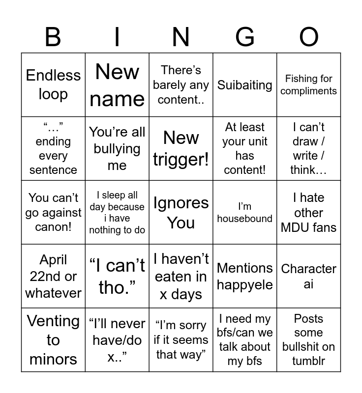 This bingo card has a free space and 24 words: “I can’t tho.”, “I’ll never have/do x..”, New trigger!, Venting to minors, Fishing for compliments, Endless loop, “…” ending every sentence, New name, I’m housebound, I haven’t eaten in x days, At least your unit has content!, You can’t go against canon!, Mentions happyele, Character ai, You’re all bullying me, I need my bfs/can we talk about my bfs, I hate other MDU fans, There’s barely any content.., I can’t draw / write / think…, I sleep all day because i have nothing to do, Posts some bullshit on tumblr, April 22nd or whatever, Suibaiting and “I’m sorry if it seems that way”.