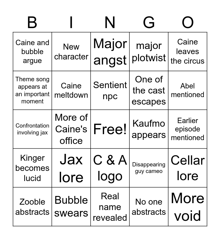 This bingo card has a free space and 24 words: Jax lore, Bubble swears, Sentient npc, Zooble abstracts, Caine leaves the circus, Caine and bubble argue, Theme song appears at an important moment, New character, Kaufmo appears, C & A logo, One of the cast escapes, Confrontation involving jax, Disappearing guy cameo, Cellar lore, Caine meltdown, No one abstracts, Earlier episode mentioned, Major angst, Abel mentioned, More of Caine's office, More void, Kinger becomes lucid, major plotwist and Real name revealed.