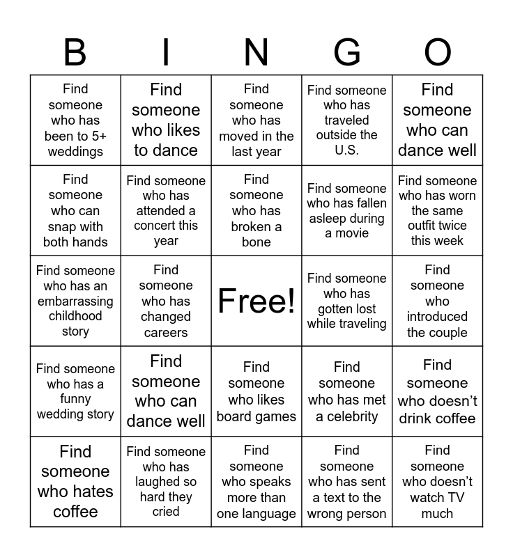 This bingo card has a free space and 204 words: Find someone who has gotten lost while traveling, Find someone who wears glasses, Find someone who can do a party trick, Find someone who has met a celebrity, Find someone who has run a race (5K or more), Find someone who has been married 10+ years, Find someone who hates coffee, Find someone who has a terrible first date story, Find someone who knows how the proposal happened, Find someone who has fallen asleep during a movie, Find someone who can whistle, Find someone who has tripped in public, Find someone who has a funny roommate story, Find someone who loves to cook, Find someone who has broken a bone doing something dumb, Find someone who knows the couple from college, Find someone who owns cowboy boots, Find someone who has been on a cruise, Find someone who snores loudly, Find someone who helped plan this party, Find someone who has a tattoo, Find someone who prefers cats over dogs, Find someone who has eaten pizza for breakfast, Find someone who is afraid of spiders, Find someone who has laughed so hard they cried, Find someone who has gotten lost while traveling, Find someone who wears glasses, Find someone who can do a party trick, Find someone who has met a celebrity, Find someone who has run a race (5K or more), Find someone who has been married 10+ years, Find someone who hates coffee, Find someone who has a terrible first date story, Find someone who knows how the proposal happened, Find someone who has fallen asleep during a movie, Find someone who can whistle, Find someone who has tripped in public, Find someone who has a funny roommate story, Find someone who loves to cook, Find someone who has broken a bone doing something dumb, Find someone who knows the couple from college, Find someone who owns cowboy boots, Find someone who has been on a cruise, Find someone who snores loudly, Find someone who helped plan this party, Find someone who has a tattoo, Find someone who prefers cats over dogs, Find someone who has eaten pizza for breakfast, Find someone who is afraid of spiders, Find someone who has laughed so hard they cried, Find someone who will sing karaoke tonight, Find someone who has traveled outside the U.S., Find someone who has an embarrassing childhood story, Find someone who has a funny wedding story, Find someone who is left-handed, Find someone who has sent a text to the wrong person, Find someone who has a weird food combination they love, Find someone who can juggle, Find someone who met the couple separately, Find someone who loves country music, Find someone who has a terrible haircut story, Find someone who has been to Nashville, Find someone who has been in a wedding party, Find someone who cried at a movie this month, Find someone who takes the longest to get ready, Find someone who has gotten caught in a huge storm, Find someone who has a funny “wrong text” story, Find someone who is an only child, Find someone who has gone camping, Find someone who has read 5+ books this year, Find someone who has met a celebrity, Find someone who has done something embarrassing on social media, Find someone who can snap with both hands, Find someone who hates cake, Find someone who has a story about getting in trouble at school, Find someone who loves karaoke, Find someone who can dance well, Find someone who speaks more than one language, Find someone who has a pet that did something crazy, Find someone who has known the bride or groom 10+ years, Find someone who is always late, Find someone who remembers the couple’s first date, Find someone who has been to 5+ weddings, Find someone who has a funny family holiday story, Find someone who plays an instrument, Find someone who helped keep the proposal secret, Find someone who has a story about missing a flight, Find someone who has broken a bone, Find someone who has an embarrassing nickname, Find someone who predicted they’d get engaged, Find someone who traveled over 2 hours to be here, Find someone who has lived in more than 3 states, Find someone who has tripped in public, Find someone who has a funny story about the couple, Find someone who caught a bouquet at a wedding, Find someone who has had a very awkward moment in public, Find someone who has worn the same outfit twice this week, Find someone who has a pet, Find someone who can do a good celebrity impression, Find someone who talks to their pets like people, Find someone who is married, Find someone who knew the bride first, Find someone who knew the groom first, Find someone who knew the couple before they dated, Find someone who introduced the couple, Find someone who has seen the couple argue, Find someone who wakes up before 6 AM, Find someone who likes pineapple on pizza, Find someone who has gotten locked out of somewhere, Find someone who has a travel disaster story, Find someone who has accidentally waved back at someone who wasn’t waving at them, Find someone who can’t keep a secret, Find someone who is the worst dancer here, Find someone who has the same birth month as you, Find someone who has a very unusual talent, Find someone who has laughed so hard they cried, Find someone who has a funny roommate story, Find someone who has fallen asleep during a movie, Find someone who prefers cats over dogs, Find someone who has run a race (5K or more), Find someone who wears glasses, Find someone who has eaten pizza for breakfast, Find someone who owns cowboy boots, Find someone who loves to cook, Find someone who can whistle, Find someone who wears the same shoe size as you, Find someone who is married, Find someone who has kids, Find someone who went to college, Find someone who can play the piano, Find someone who has a sibling, Find someone who is the oldest sibling, Find someone who is the youngest sibling, Find someone who has more than 3 siblings, Find someone who has twins in their family, Find someone who owns their home, Find someone who has moved in the last year, Find someone who h