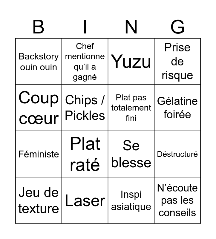 This bingo card has 16 words: Laser, Déstructuré, Yuzu, Backstory ouin ouin, Féministe, Chef mentionne qu’il a gagné, Se blesse, Inspi asiatique, Coup cœur, Chips / Pickles, Jeu de texture, Prise de risque, Plat raté, Gélatine foirée, Plat pas totalement fini and N’écoute pas les conseils.