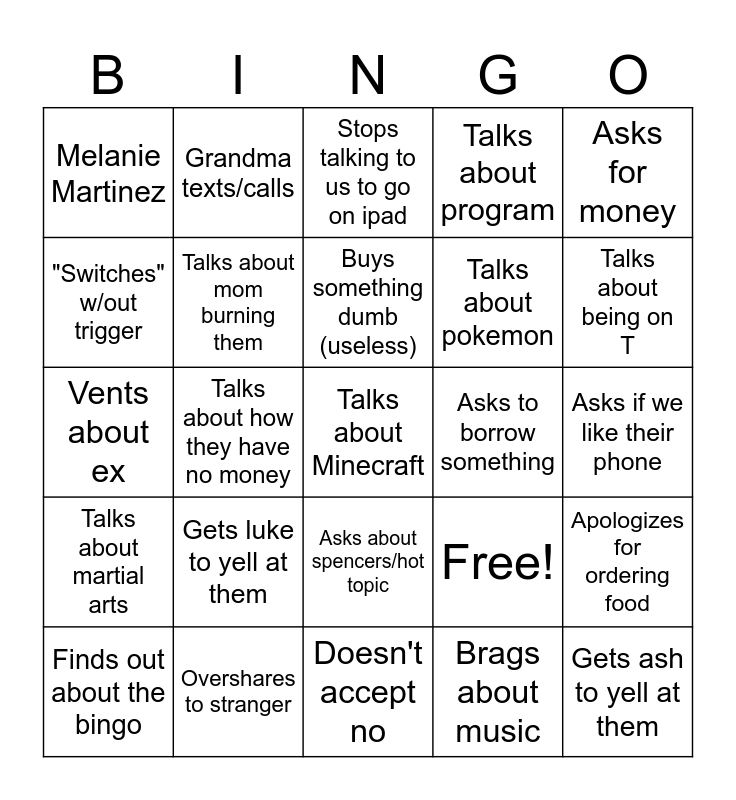 This bingo card has 25 words: Gets luke to yell at them, Doesn't accept no, Buys something dumb (useless), Finds out about the bingo, Asks for money, Melanie Martinez, "Switches" w/out trigger, Grandma texts/calls, Asks to borrow something, Asks about spencers/hot topic, Talks about pokemon, Vents about ex, Free!, Apologizes for ordering food, Talks about mom burning them, Gets ash to yell at them, Asks if we like their phone, Stops talking to us to go on ipad, Talks about being on T, Talks about how they have no money, Talks about Minecraft, Overshares to stranger, Talks about martial arts, Talks about program and Brags about music.