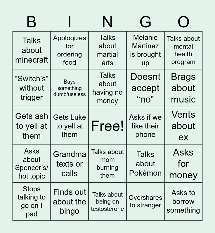 This bingo card has a free space and 24 words: Grandma texts or calls, Finds out about the bingo, Talks about having no money, Stops talking to go on I pad, Talks about mental health program, Talks about minecraft, “Switch’s” without trigger, Apologizes for ordering food, Asks if we like their phone, Talks about mom burning them, Doesnt accept “no”, Gets ash to yell at them, Talks about Pokémon, Asks for money, Buys something dumb/useless, Overshares to stranger, Vents about ex, Talks about martial arts, Brags about music, Gets Luke to yell at them, Asks to borrow something, Asks about Spencer’s/ hot topic, Melanie Martinez is brought up and Talks about being on testosterone.