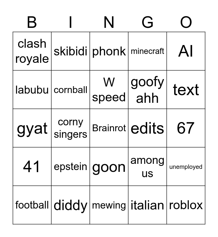 This bingo card has a free space and 24 words: epstein, diddy, W speed, football, AI, clash royale, labubu, skibidi, edits, goon, goofy ahh, gyat, among us, unemployed, cornball, italian, 67, phonk, text, corny singers, roblox, 41, minecraft and mewing.