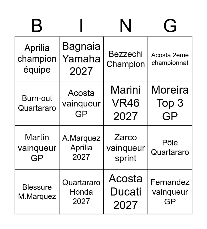 This bingo card has 16 words: Quartararo Honda 2027, Pôle Quartararo, Bezzechi Champion, Aprilia champion équipe, Martin vainqueur GP, Bagnaia Yamaha 2027, Zarco vainqueur sprint, Acosta Ducati 2027, Burn-out Quartararo, Acosta vainqueur GP, Blessure M.Marquez, Acosta 2ème championnat, A.Marquez Aprilia 2027, Moreira Top 3 GP, Marini VR46 2027 and Fernandez vainqueur GP.