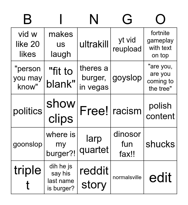 This bingo card has a free space and 24 words: where is my burger?!, dih he js say his last name is burger?, theres a burger, in vegas, triple t, fortnite gameplay with text on top, vid w like 20 likes, "person you may know", makes us laugh, racism, larp quartet, goyslop, politics, dinosor fun fax!!, shucks, "fit to blank", normalsville, polish content, ultrakill, "are you, are you coming to the tree", show clips, edit, goonslop, yt vid reupload and reddit story.
